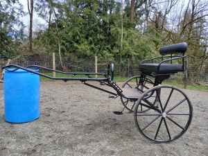 2021 Frey Sprint cart, black, medium pony, 12.2-13.2hh. New condition, never used, marathon shafts, rubber wheels. Height of seat, 43", height back of shaft, 34". Minimum shaft adjustment 24", widest 36". Seat width 36",
